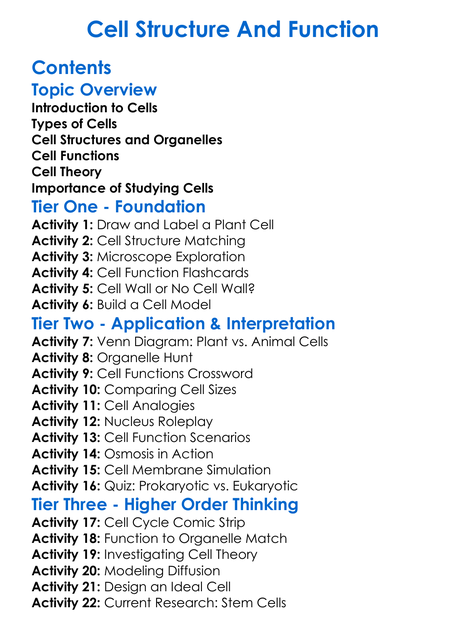 Cell Structure And Function Worksheet Activity Booklet
