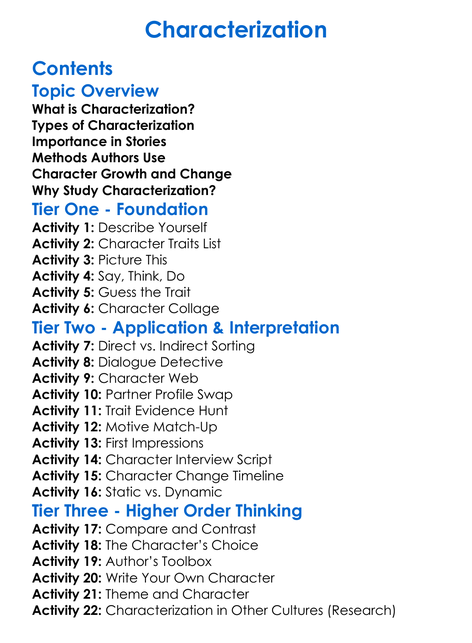 Characterization Worksheet Activity Booklet