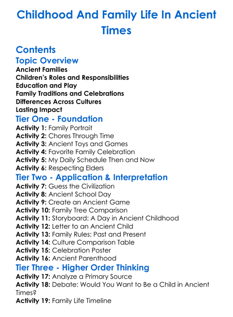 Childhood And Family Life In Ancient Times Worksheet Activity Booklet