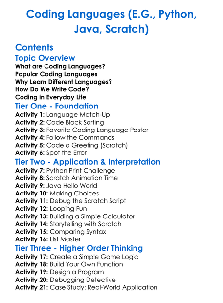 Coding Languages Eg Python Java Scratch Worksheet Activity Booklet