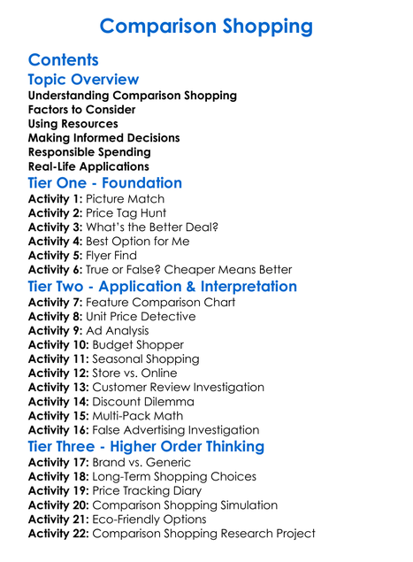 Comparison Shopping Worksheet Activity Booklet
