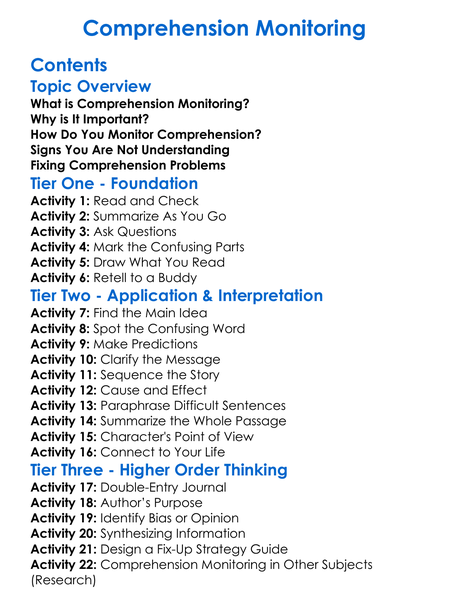 Comprehension Monitoring Worksheet Activity Booklet