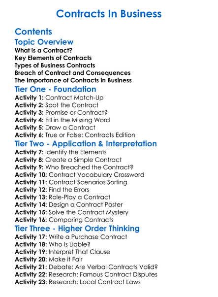 Contracts In Business Worksheet Activity Booklet