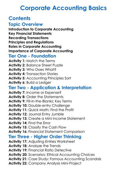 Corporate Accounting Basics Worksheet Activity Booklet