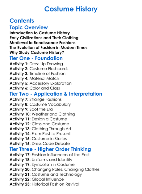 Costume History Worksheet Activity Booklet