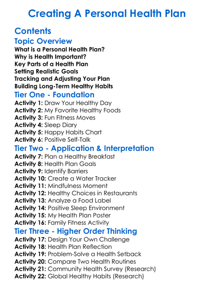 Creating A Personal Health Plan Worksheet Activity Booklet