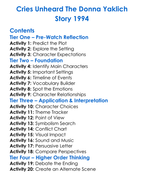 Cries Unheard The Donna Yaklich Story 1994 Worksheet Activity Booklet