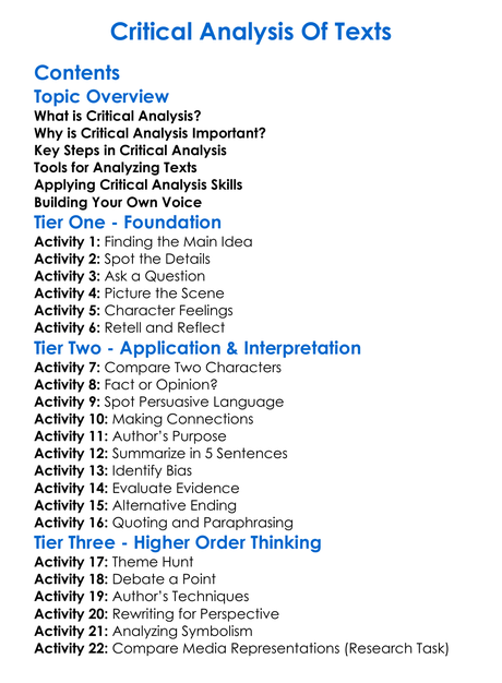 Critical Analysis Of Texts Worksheet Activity Booklet