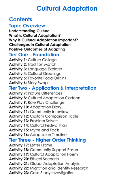 Cultural Adaptation Worksheet Activity Booklet