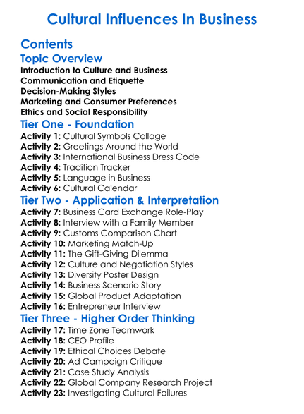 Cultural Influences In Business Worksheet Activity Booklet