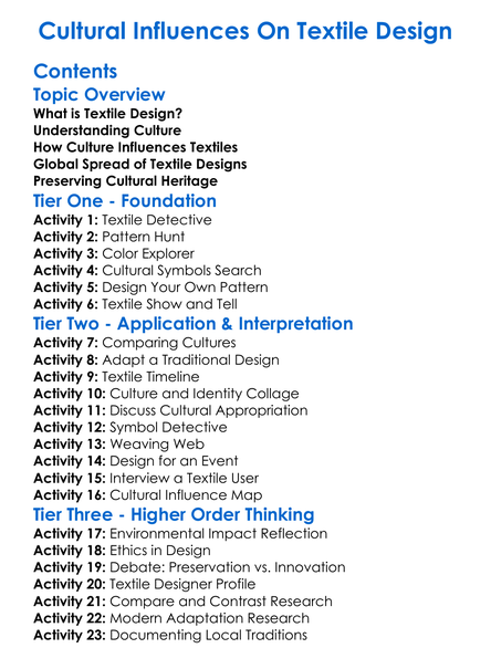Cultural Influences On Textile Design Worksheet Activity Booklet
