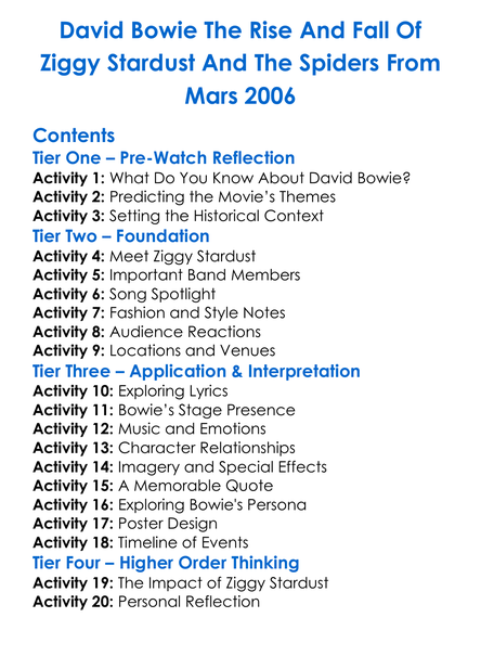 David Bowie The Rise And Fall Of Ziggy Stardust And The Spiders From Mars 2006 Worksheet Activity Booklet