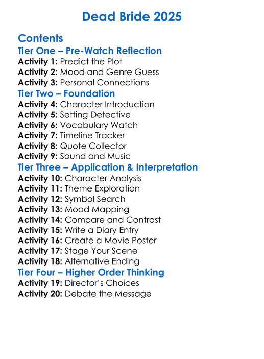 Dead Bride 2025 Worksheet Activity Booklet