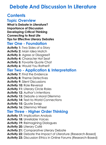 Debate And Discussion In Literature Worksheet Activity Booklet