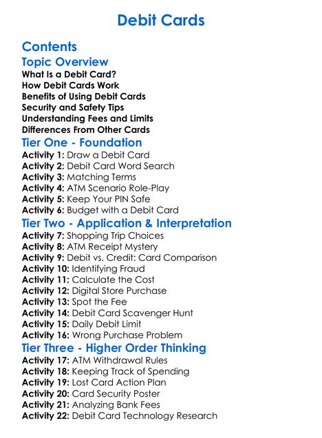 Debit Cards Worksheet Activity Booklet