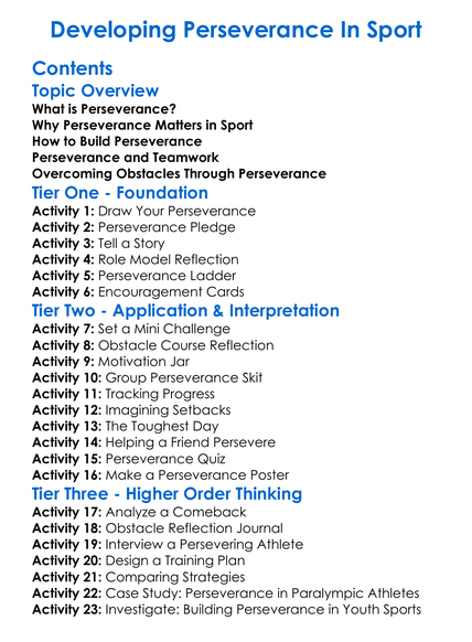Developing Perseverance In Sport Worksheet Activity Booklet