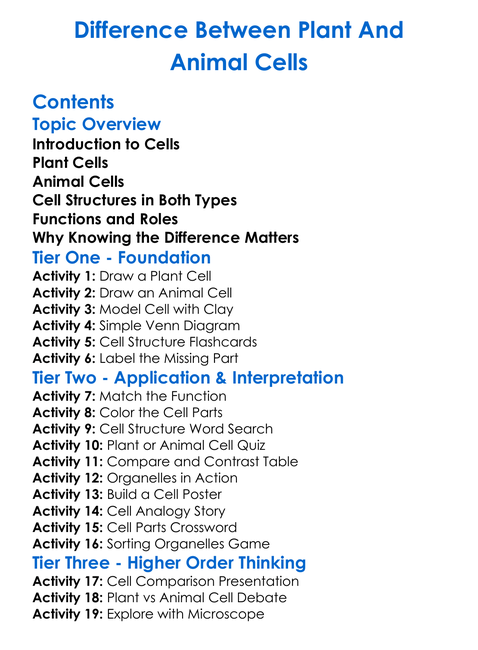 Difference Between Plant And Animal Cells Worksheet Activity Booklet