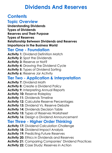 Dividends And Reserves Worksheet Activity Booklet