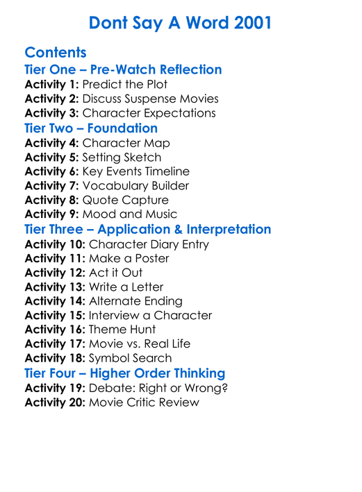 Dont Say A Word 2001 Worksheet Activity Booklet