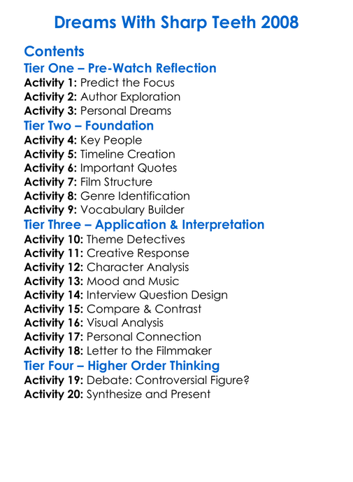 Dreams With Sharp Teeth 2008 Worksheet Activity Booklet