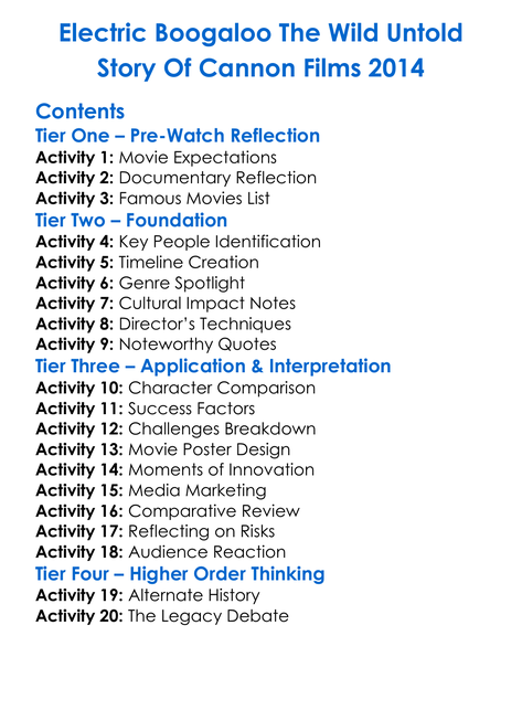 Electric Boogaloo The Wild Untold Story Of Cannon Films 2014 Worksheet Activity Booklet