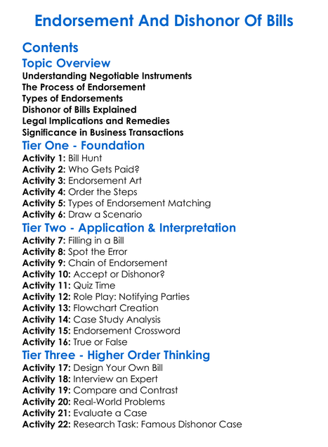 Endorsement And Dishonor Of Bills Worksheet Activity Booklet