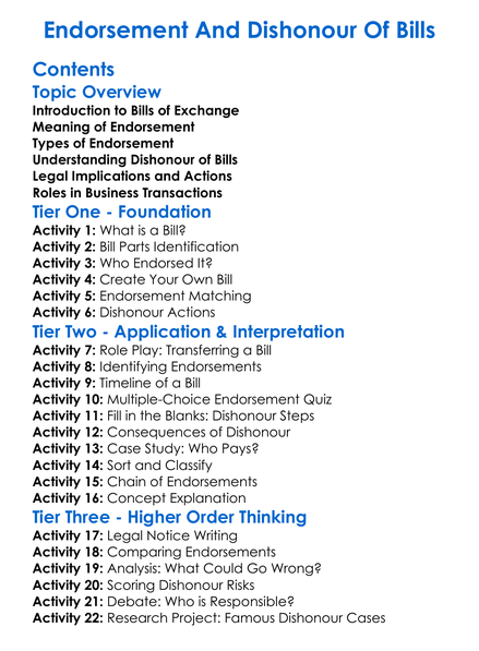 Endorsement And Dishonour Of Bills Worksheet Activity Booklet