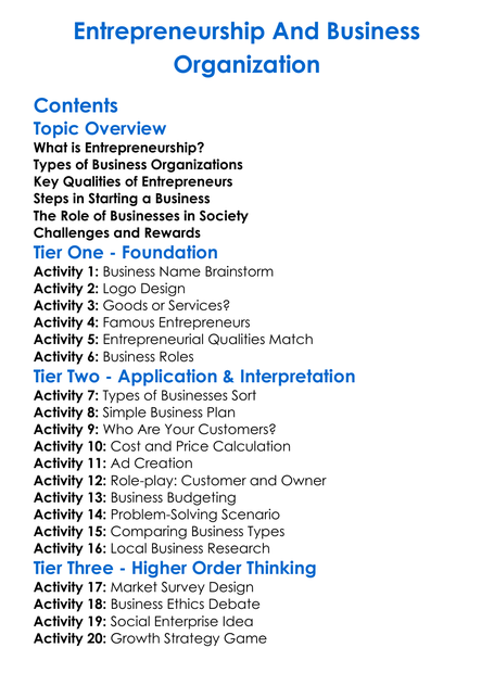 Entrepreneurship And Business Organization Worksheet Activity Booklet