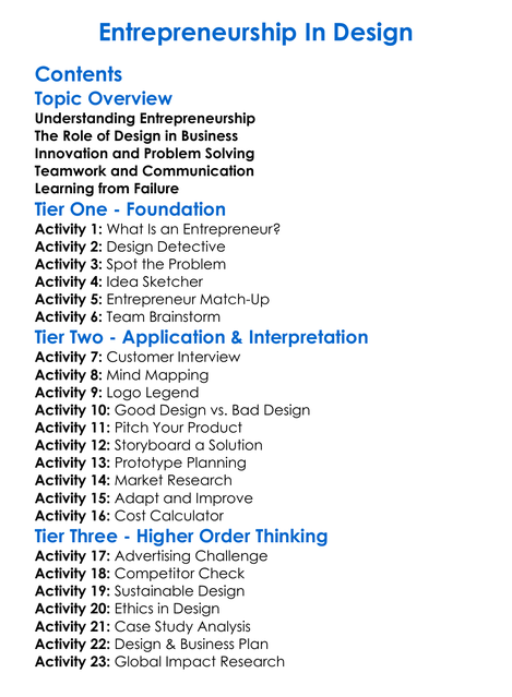 Entrepreneurship In Design Worksheet Activity Booklet
