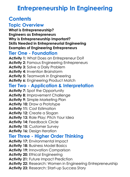 Entrepreneurship In Engineering Worksheet Activity Booklet