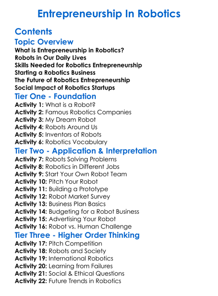 Entrepreneurship In Robotics Worksheet Activity Booklet