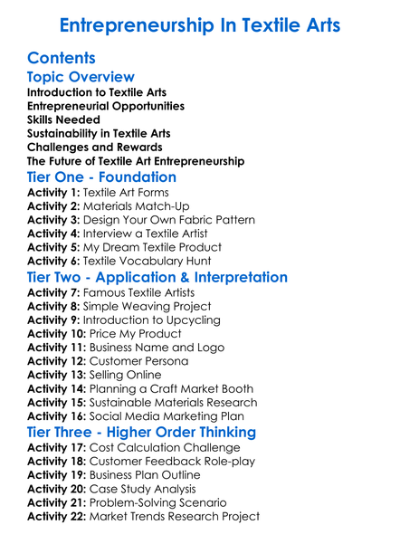 Entrepreneurship In Textile Arts Worksheet Activity Booklet