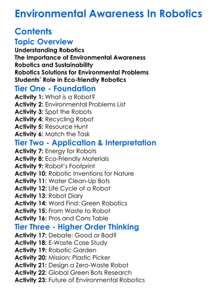 Environmental Awareness In Robotics Worksheet Activity Booklet