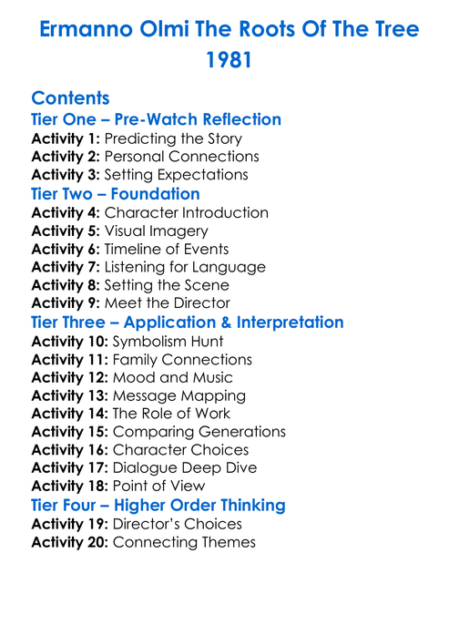 Ermanno Olmi The Roots Of The Tree 1981 Worksheet Activity Booklet