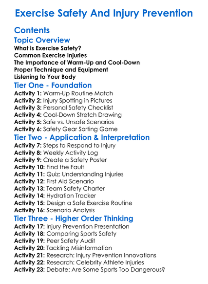 Exercise Safety And Injury Prevention Worksheet Activity Booklet