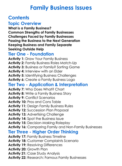 Family Business Issues Worksheet Activity Booklet