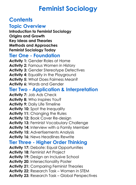 Feminist Sociology Worksheet Activity Booklet