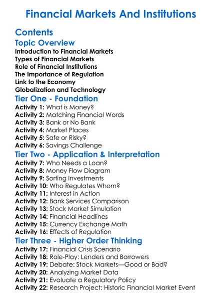 Financial Markets And Institutions Worksheet Activity Booklet