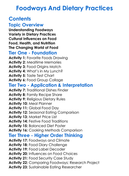 Foodways And Dietary Practices Worksheet Activity Booklet
