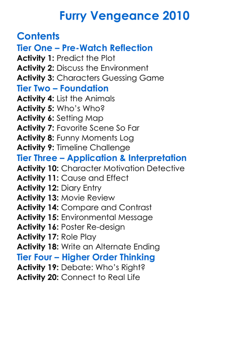 Furry Vengeance 2010 Worksheet Activity Booklet