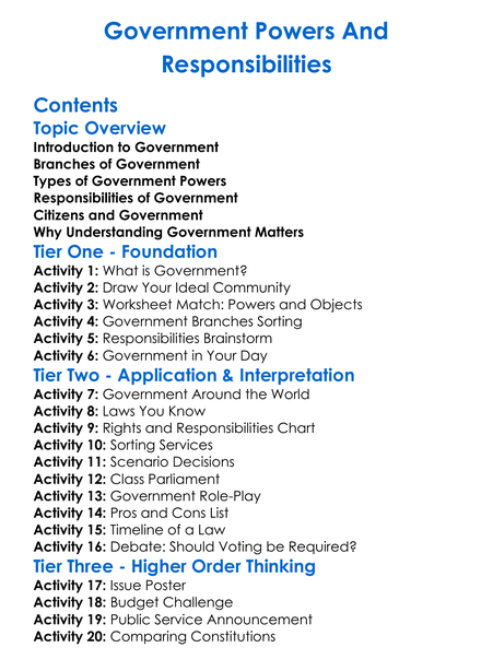 Government Powers And Responsibilities Worksheet Activity Booklet