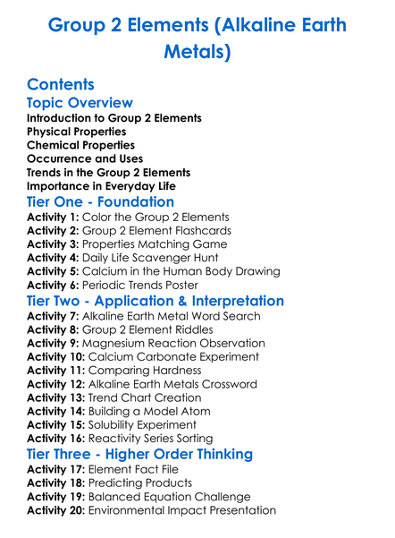 Group 2 Elements Alkaline Earth Metals Worksheet Activity Booklet