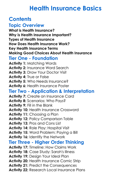 Health Insurance Basics Worksheet Activity Booklet