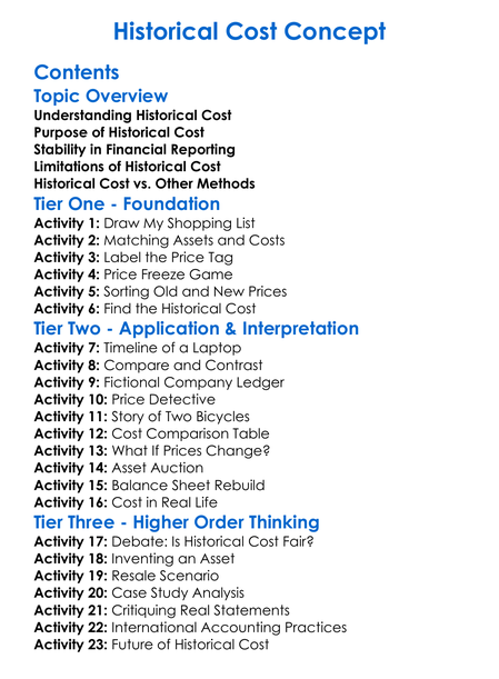 Historical Cost Concept Worksheet Activity Booklet