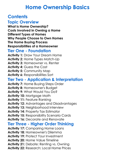 Home Ownership Basics Worksheet Activity Booklet