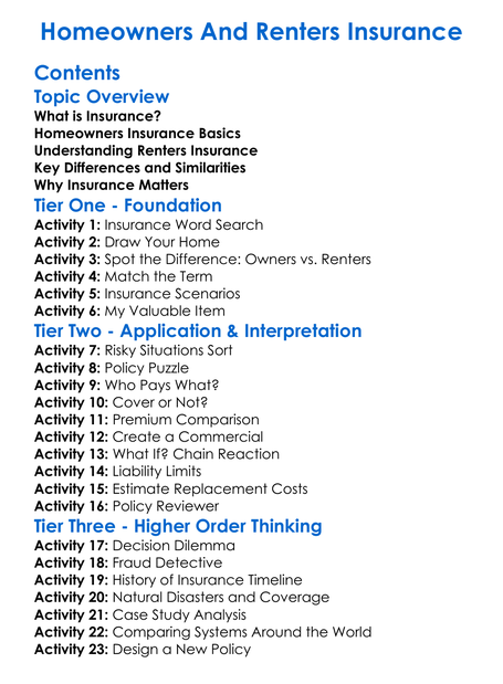 Homeowners And Renters Insurance Worksheet Activity Booklet