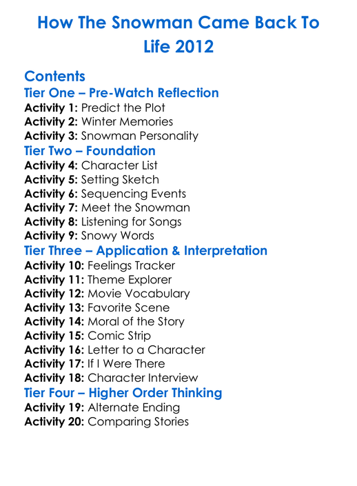 How The Snowman Came Back To Life 2012 Worksheet Activity Booklet