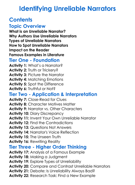 Identifying Unreliable Narrators Worksheet Activity Booklet