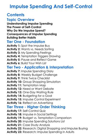 Impulse Spending And Self-Control Worksheet Activity Booklet