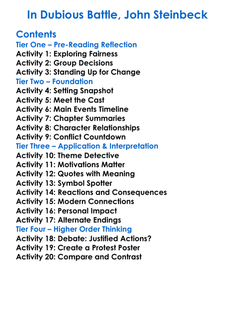 In Dubious Battle John Steinbeck Worksheet Activity Booklet